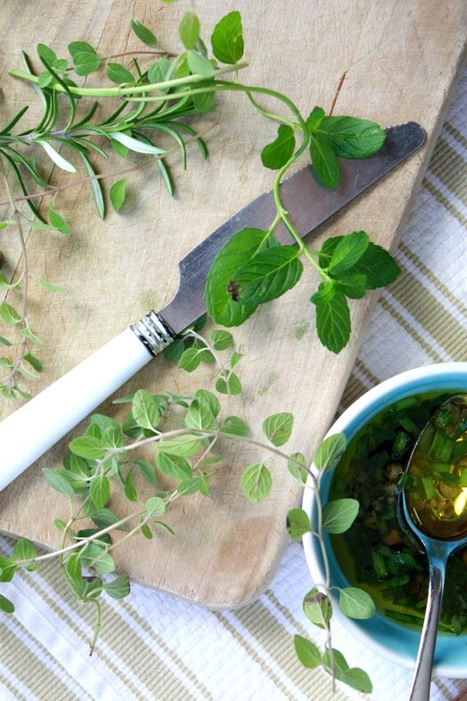 1/2 cup roughly chopped herbs (I used rosemary, oregano, thyme, basil and mint)