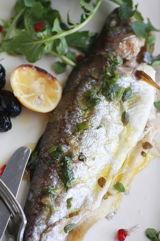Anytime I prepare whole fish, thoughts of platters of crispy-skinned sardines and red mullet (or Sultan Ibrahim as it’s called in Lebanon) flood my vision.  It was my favorite way to eat fish growing up – crispy fish, lemon to squeeze and a garlicky tahini sauce!!