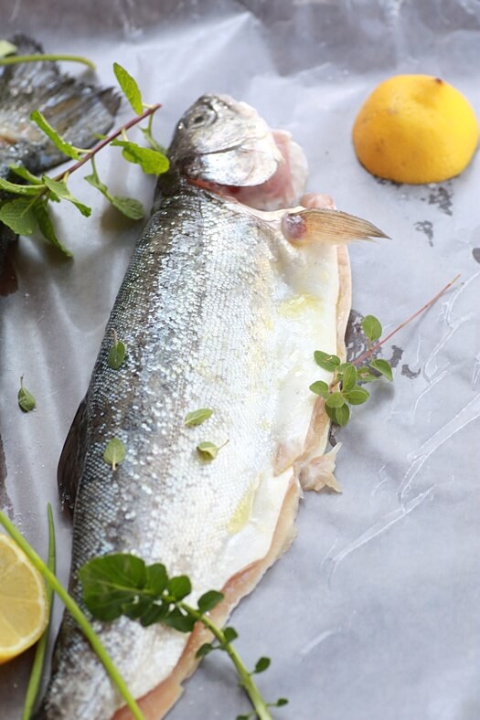 Clean the fish if needed, sprinkle with salt and olive oil. Slice the lemon into thing circles and place about 2 or 3 slices inside each fish.  Place on a baking sheet and roast in a preheated over at 400ËšF for 15 minutes (depending on the size of the fish).
