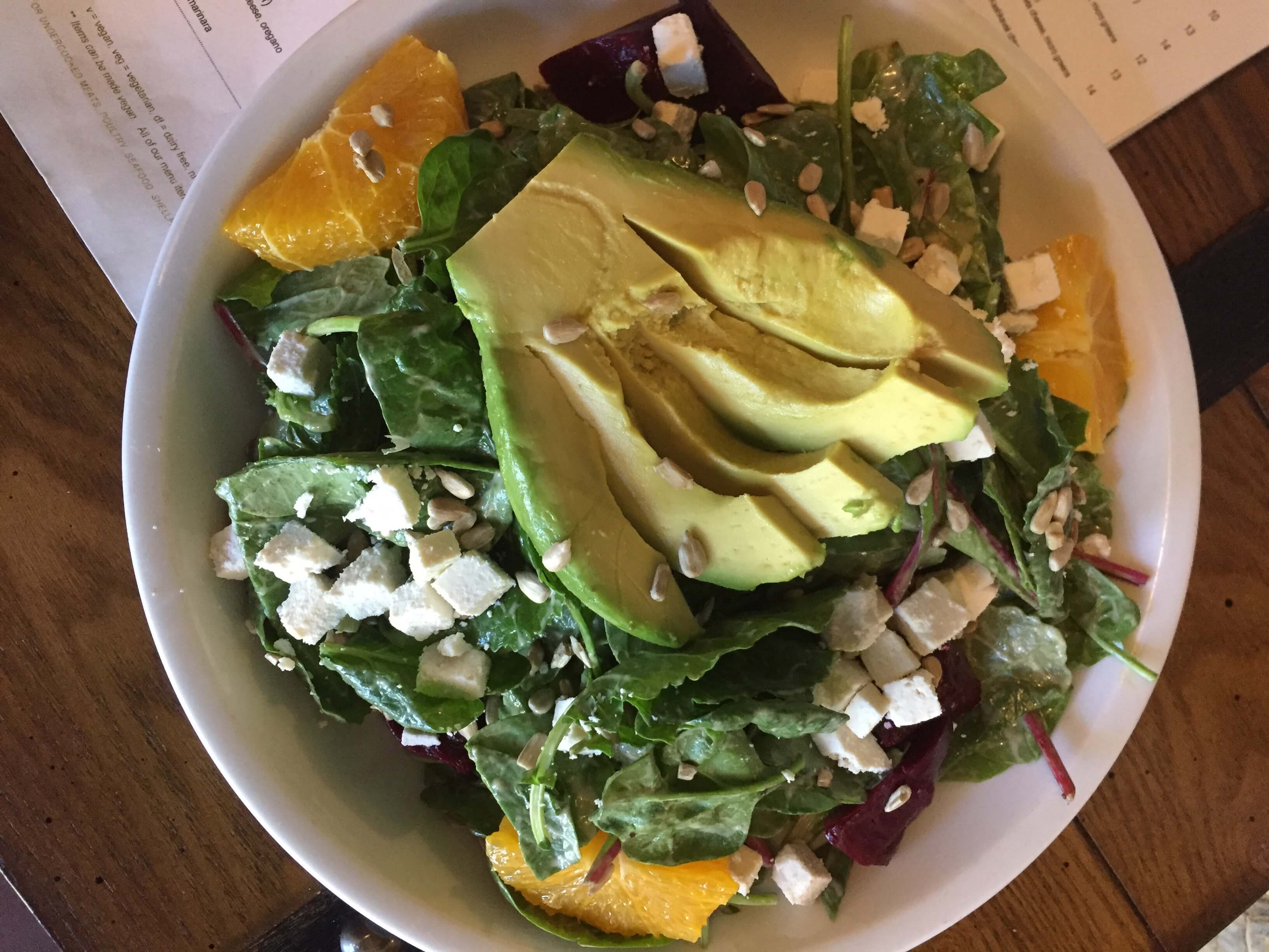 Kale mix, avocado, roasted sweet potato, citrus fruit, Mizithra cheese, sunflower seeds, tossed in our fig vinaigrette