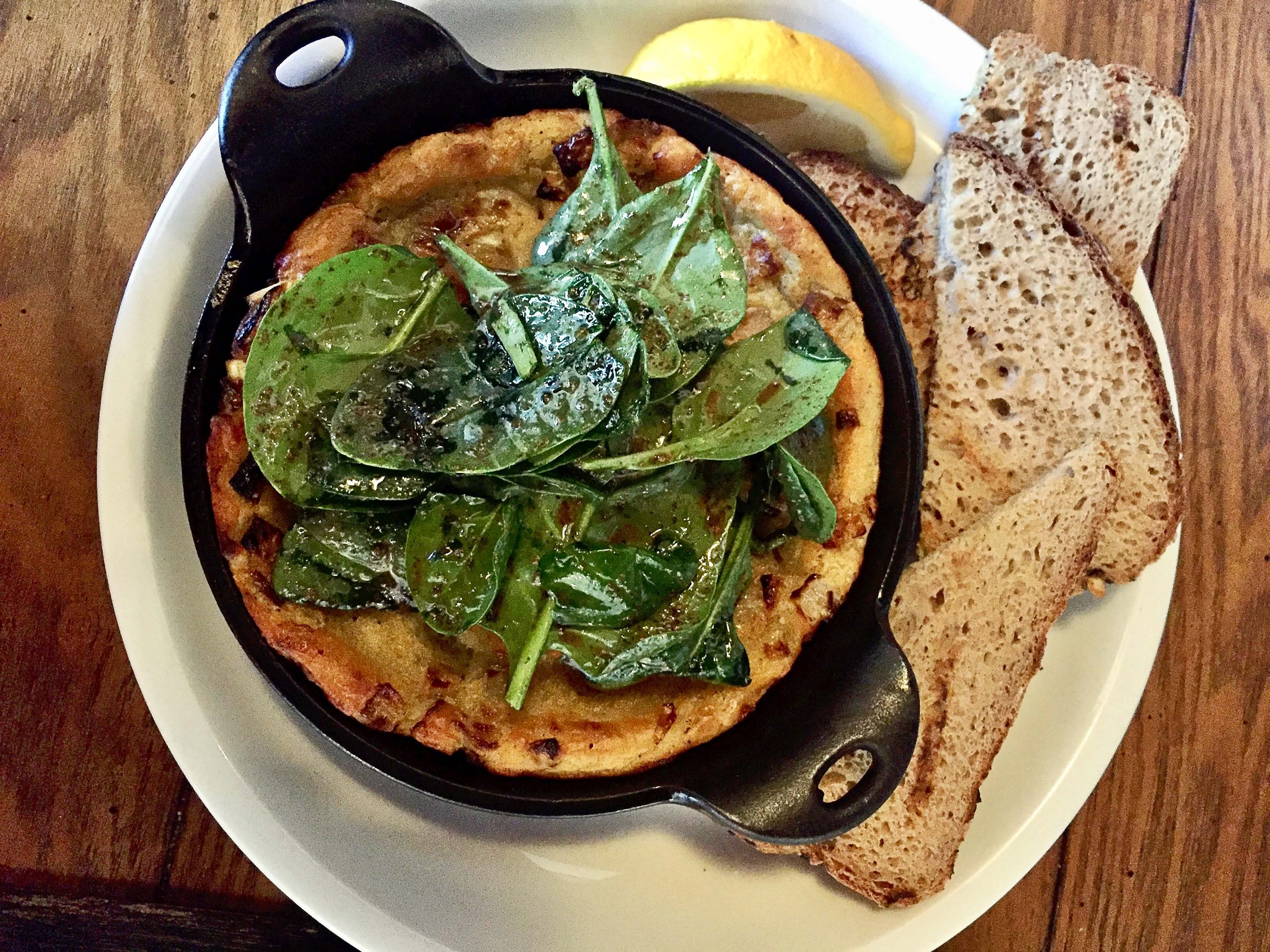 Baked chickpea torta, sweet onions, rosemary, spinach salad, sourdough toast