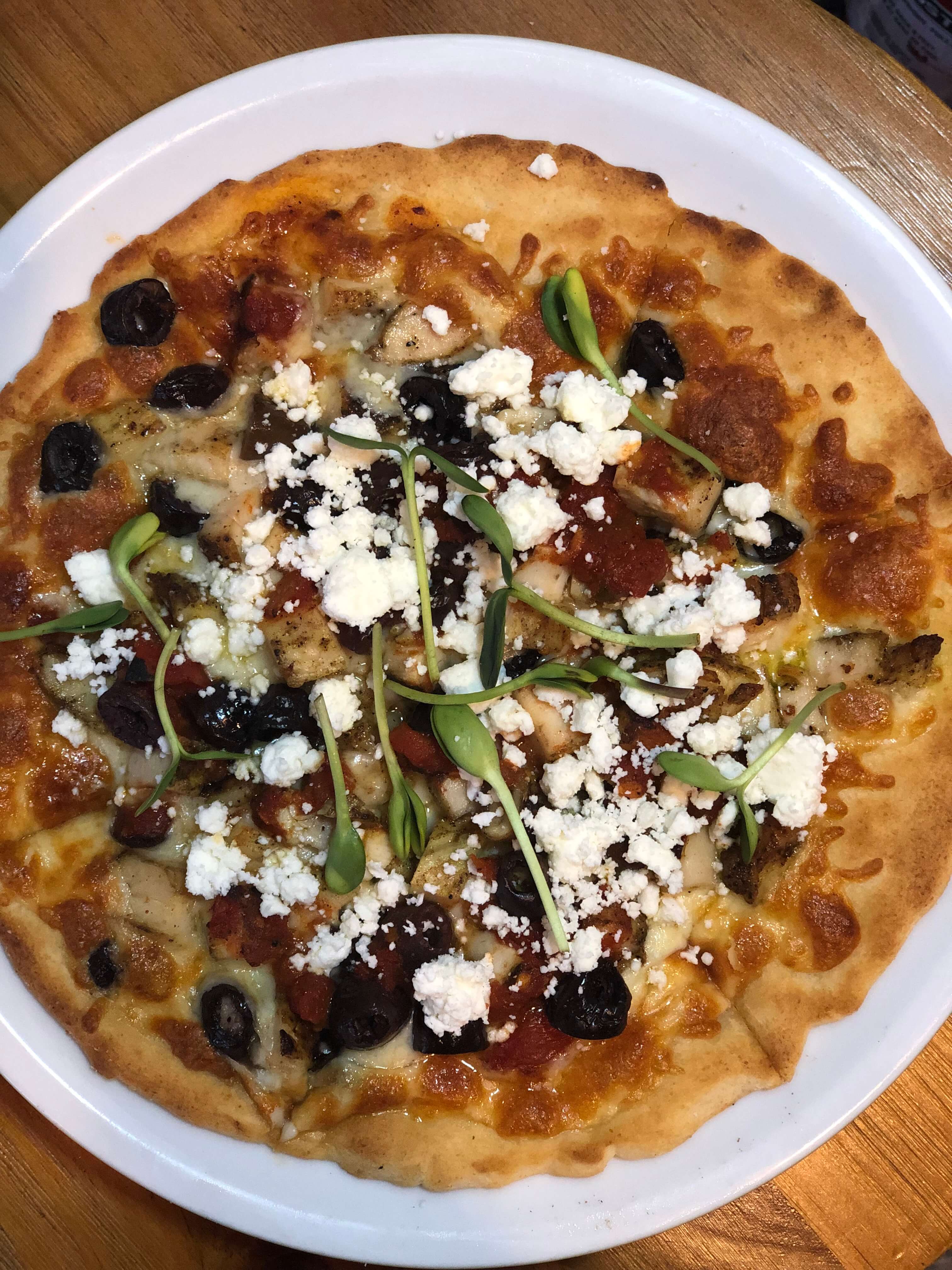 Marinara sauce, Kashkaval cheese, olives, barrel-aged feta cheese, micro greens