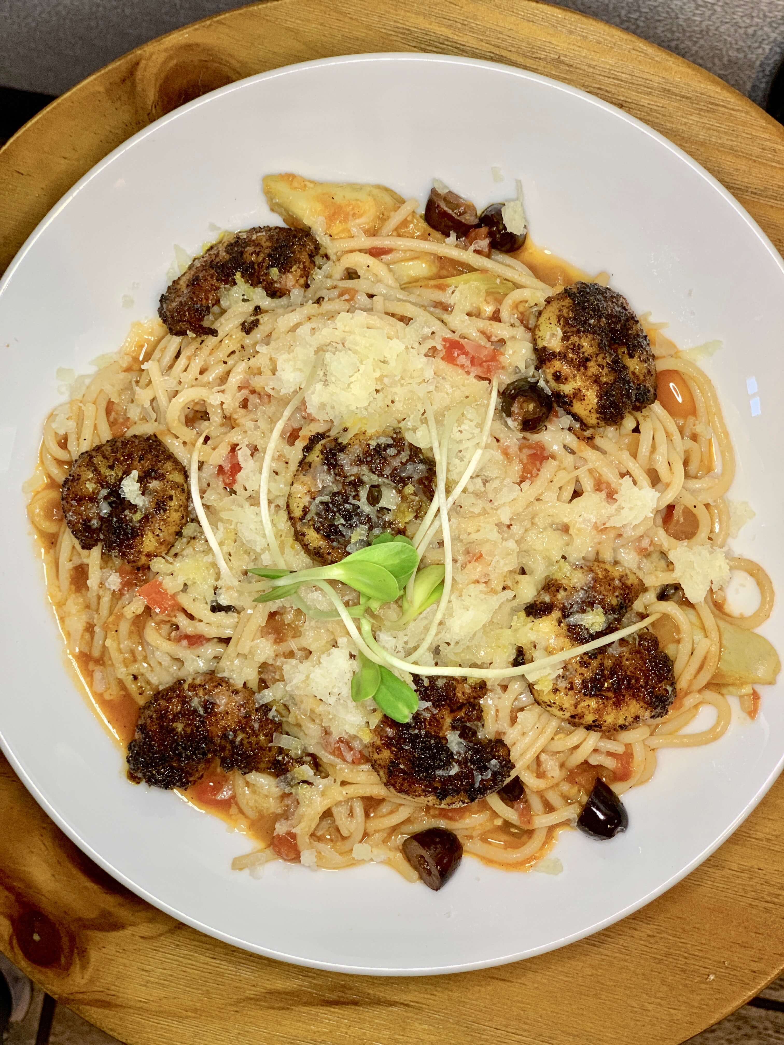 Artichoke, olive, in a fire-roasted tomato sauce, Manchego cheese